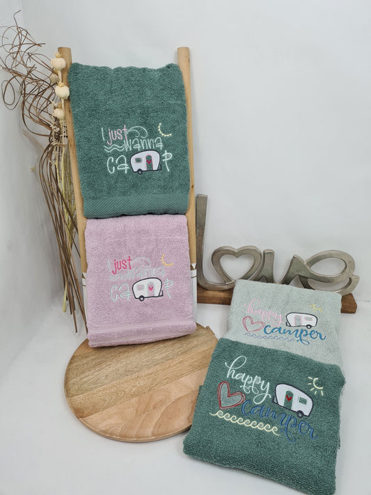 Besticktes Handtuch für Camping-Freunde "Urlaub fängt im Wohnwagen an"