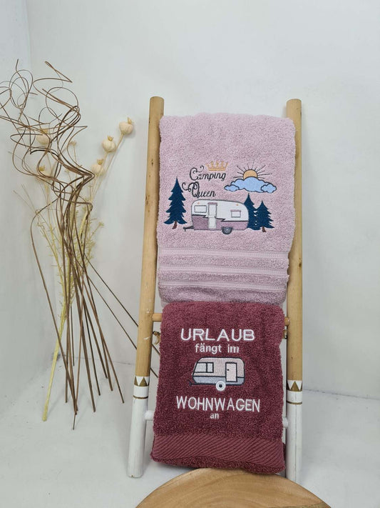 Besticktes Handtuch für Camping-Freunde "Urlaub fängt im Wohnwagen an"