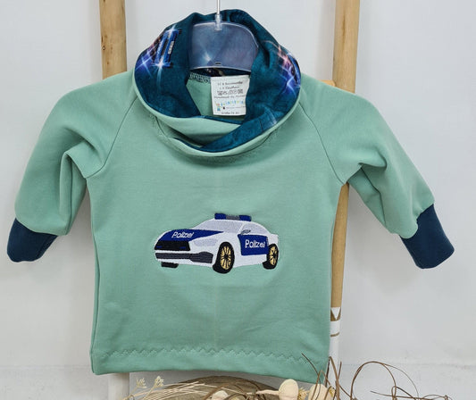 Sweatshirt grün mit großer Stickerei Polizeiauto und Hoodiekragen