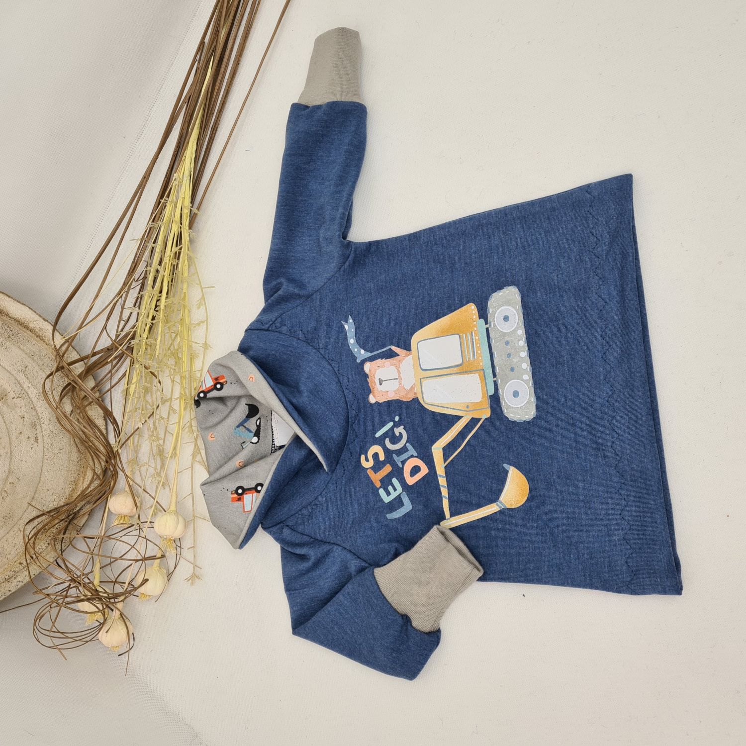Dieser coole Sweat-Hoodie mit Baustellenfahrzeugen und dem Schriftzug „Let’s Dig“ ist ein echtes Must-have für kleine Bauarbeiter-Fans. Das liebevolle Motiv mit Bagger & Co. macht den Hoodie zum absoluten Hingucker – ideal für Alltag, Kindergarten und jedes Abenteuer draußen.